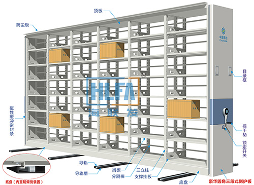 密集架按結構分類有兩種形式,半封閉式密集架和全封閉式密集架,海發(fā)HF-MJFB051號密集架就是全封閉式密集架。全封閉式密集架主體由立柱、層板、頂板、底板、節(jié)間側板、節(jié)與節(jié)之前的封板和最外側護板、列門板等組成,比半封閉式密集架多了私密性,因此主要用于存放私密性較強或較小物品的存儲。